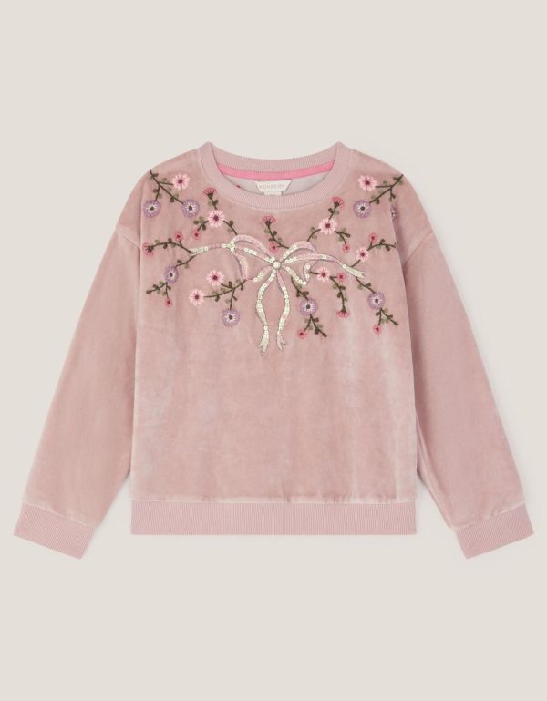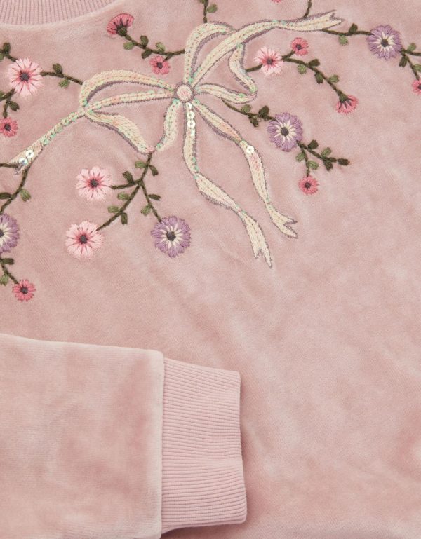 Cosy season. Made from super-soft velour fabric in a dusty pink color,this sweatshirt is decorated with a sequin bow and colorful floral embroidery around the crew neckline. Purple