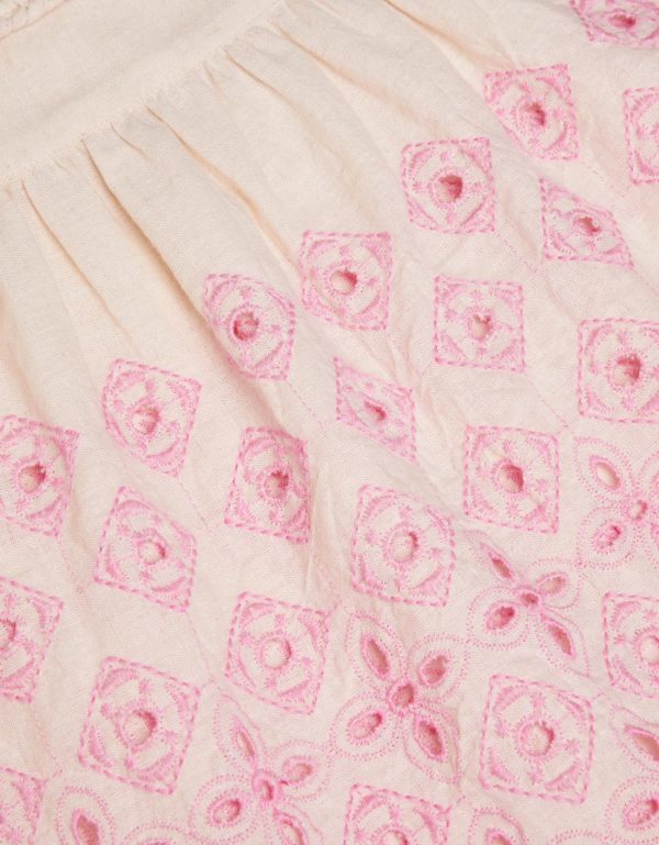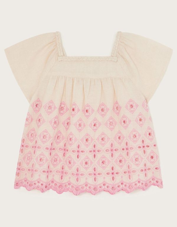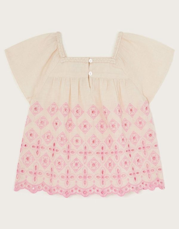 Summer neutrals. Designed in a breezy silhouette with frilly sleeves and a square neckline,this top is embellished with pink broderie details that finish at the hem. Matching pants available. Ivory