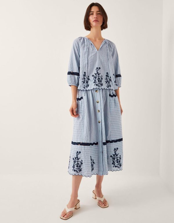 Very Cottagecore. Made from lightweight cotton fabric,this blouse is decorated with stripes,floral embroidery,ric-rac panels and a scalloped hem. Finished with an open v-neck and 3/4 length sleeves. Create a chic,co-ordinated look with the matching Cara Embroidered Stripe Midi Skirt. Blue