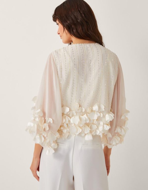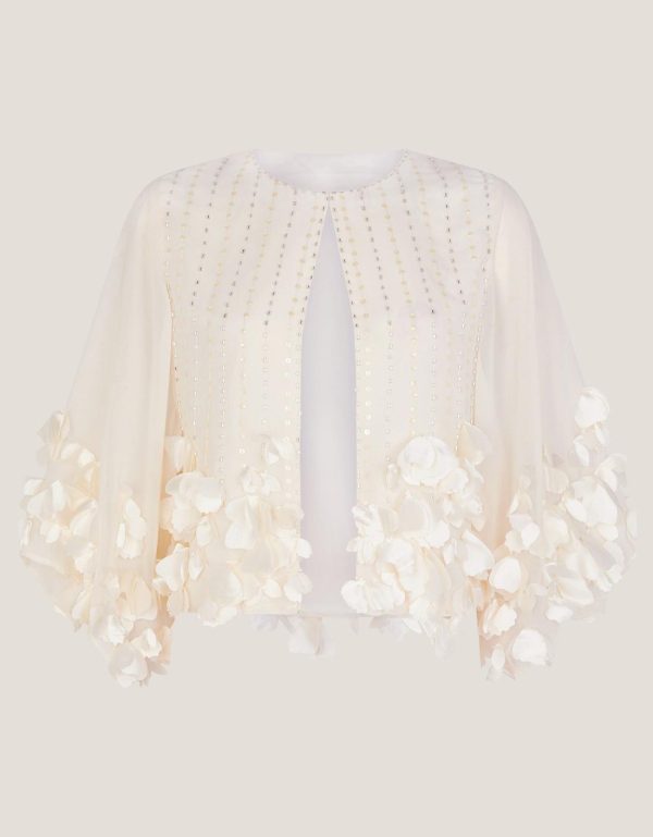 Petal to the metal. For days when your occasion looks need a little ta-da,this cover up is embellished with delicate sequins,floaty sleeves,and a flurry of 3D flowers. This dreamy cover up turns even your most simple outfit into a moment. Bridal? Maybe. Brilliant? Definitely. Ivory
