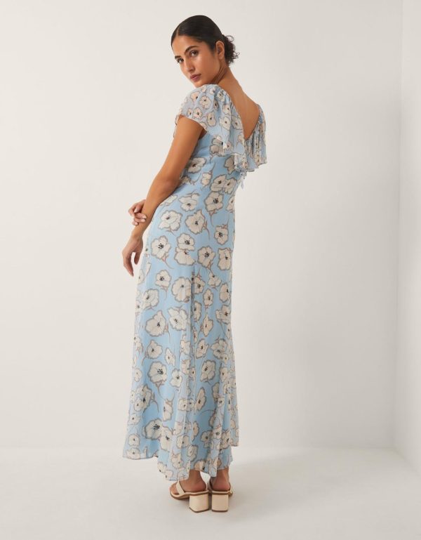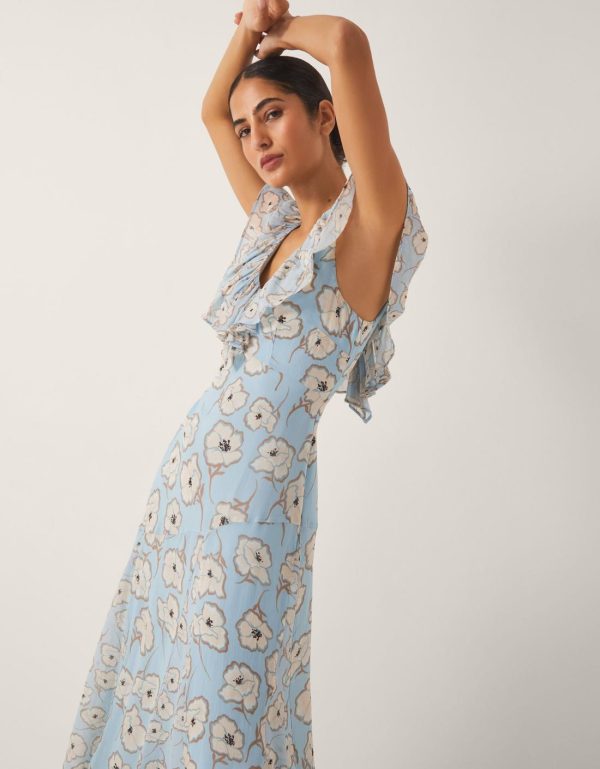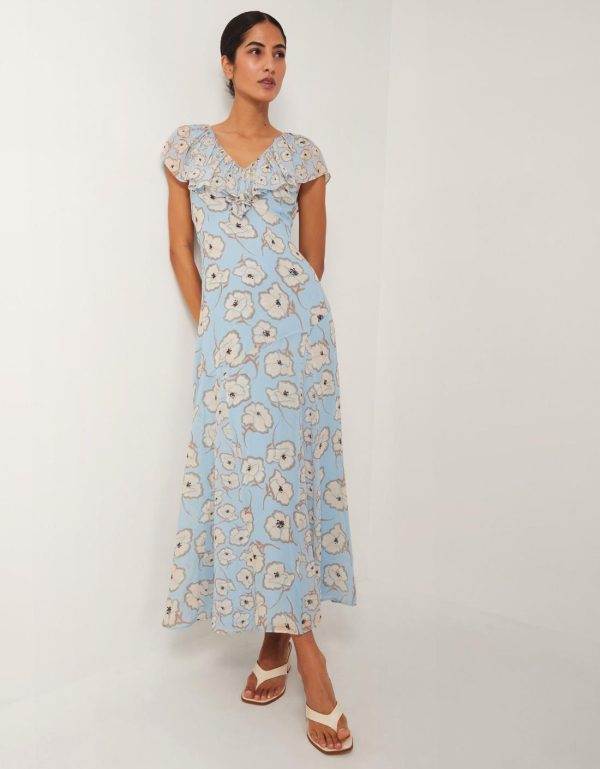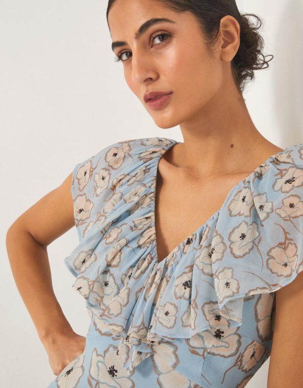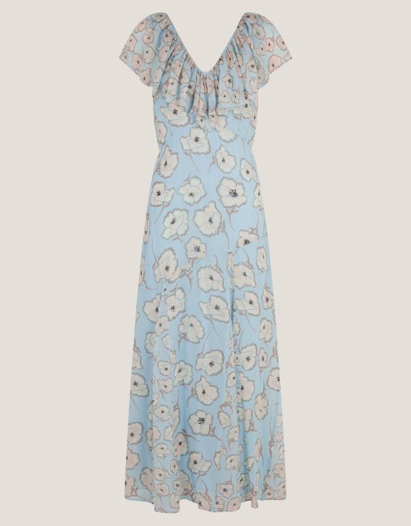 A frock worth making plans for. Perfect for special occasions,this maxi dress is designed with a ruffle neckline and blossoming florals in feminine hues. Just add your favorite heels. Blue