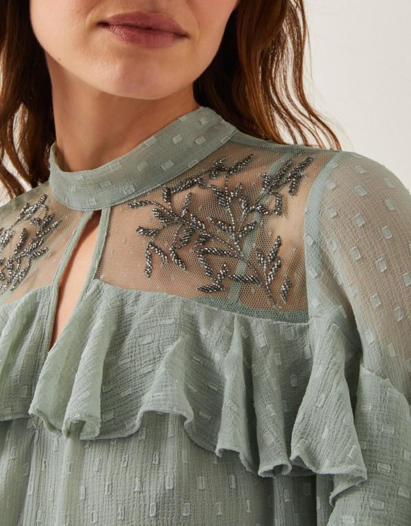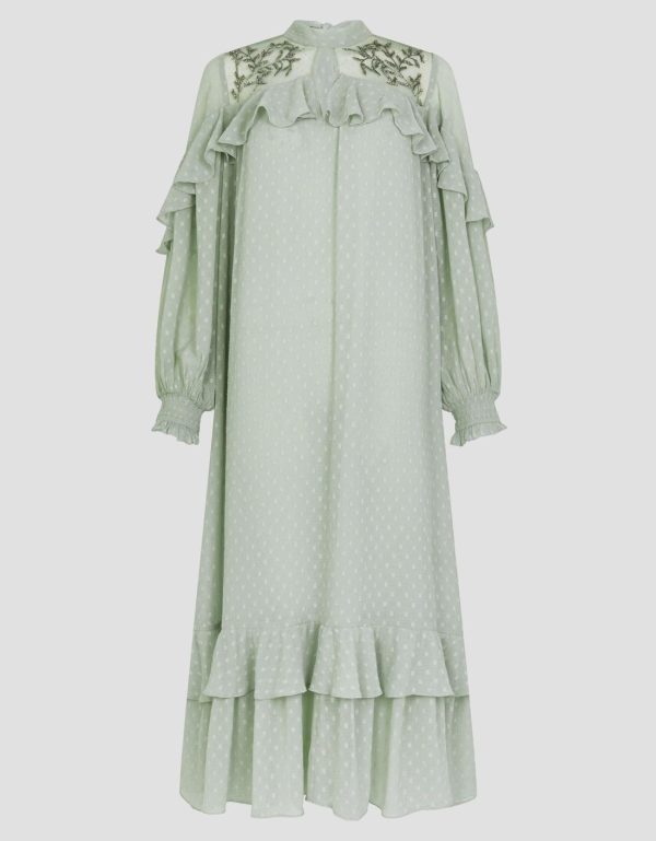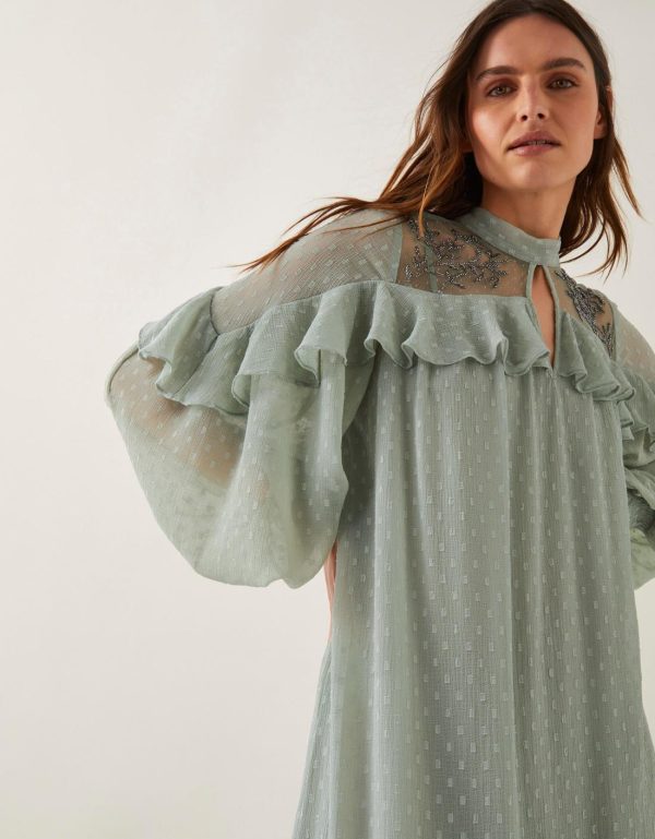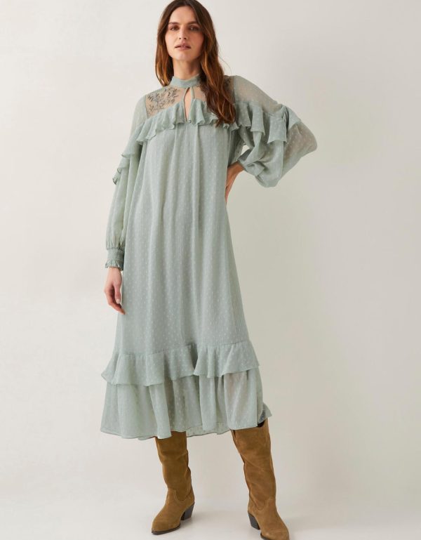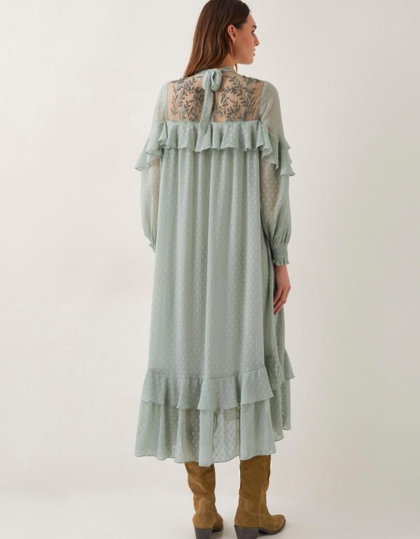 Very Sienna Miller. Showcasing statement ruffles and beaded floral designs over the mesh top panels,this floaty midi dress is a sheer delight for your wardrobe. Style it with cowboy boots for a cool boho look or dress it up with your favorite heels. Green
