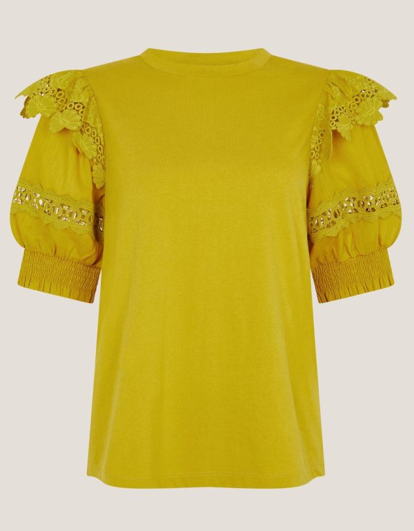Find some serious serotonin here. Soaked in a vibrant mustard yellow hue,this top is designed with a soft jersey base and dramatic puff sleeves with floral broderie frills. Best paired with your favorite denim and loafers. Yellow