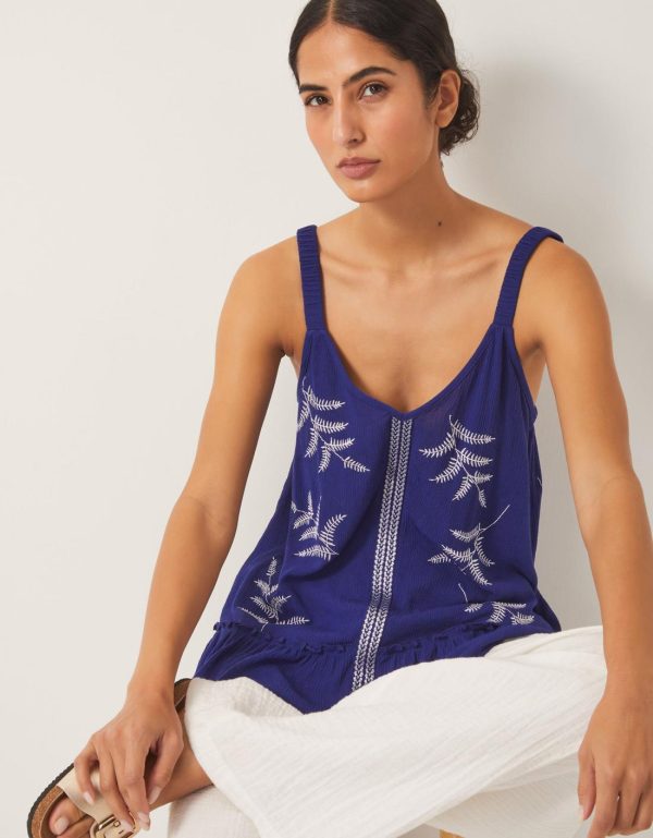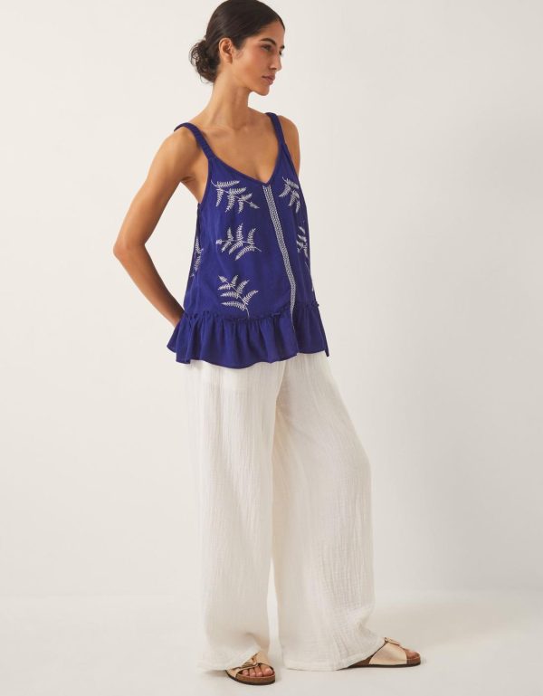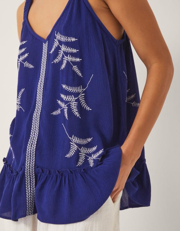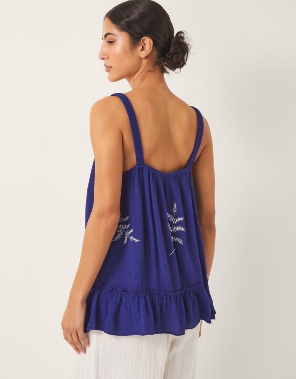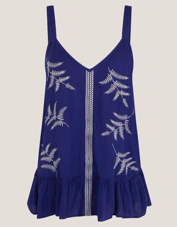 Just leaf it. An elevated iteration of a classic cami,this top is designed with a v-neckline,frilly hem and fern leaves embroidered over the lightly textured fabric. Complete the look with wide leg linen pants for a laidback summer vibe. Blue