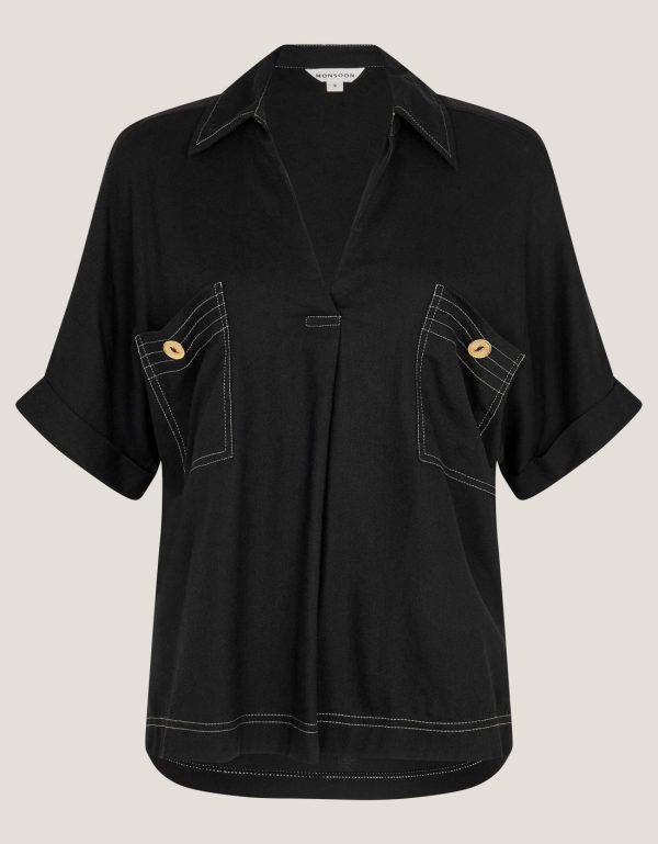 Keep it simple. Cut in a relaxed,boxy fit,this top features a sharp collar,short sleeves and two patch pockets for a utility feel. It’s finished with contrast stitching,adding an elevated touch to this contemporary,versatile style. Black