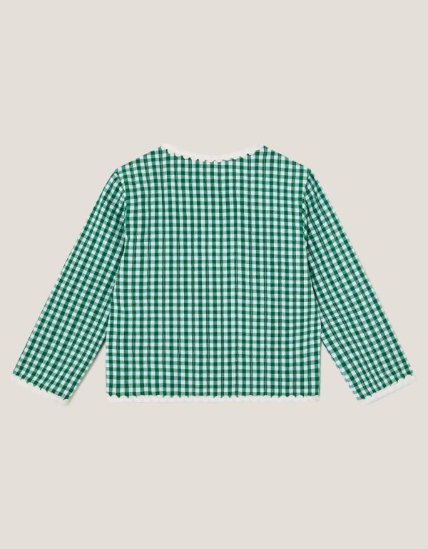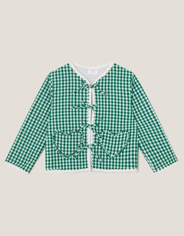 Trend envy—because kids can be stylish,too! Get into the gingham trend this summer and kit out their wardrobe with this jacket. Finished with adorable ruffle heart pockets,it fastens through the front with four individual ties. Green