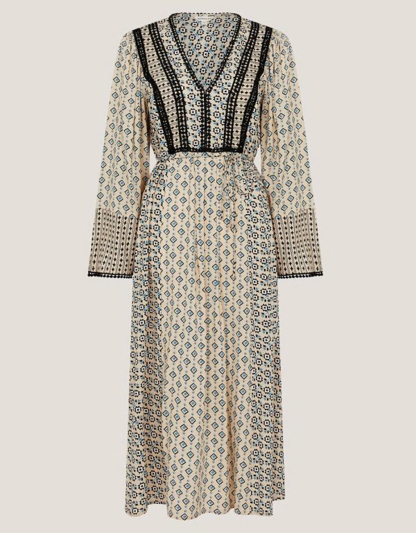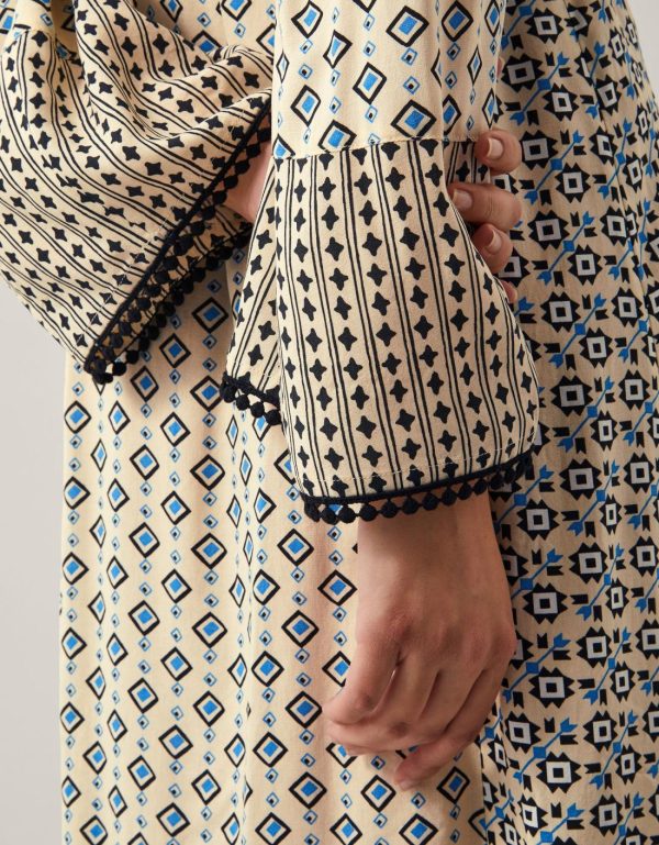 Beauty,brains,bohemia. A printed piece of perfection for your warm-weather wardrobe,this dress is decorated with geometric patterns in blue and monochrome hues. Designed with an embroidered bodice,long sleeves and a midi-length hem. Ivory