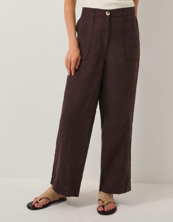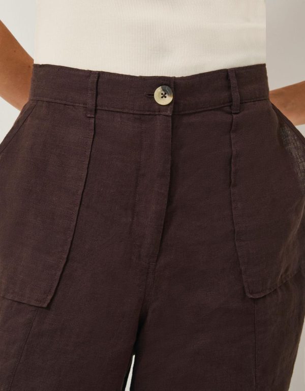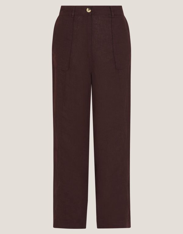 Stay chic in the heat. Whisked from 100% linen in a dreamy chocolate tone,these pants are cut with a slouchy straight leg fit and high waistline,waiting to be tucked over all the tanks,tops and tees in your summer closet. Finished with a front button zipper and four pockets at the sides and back. Brown