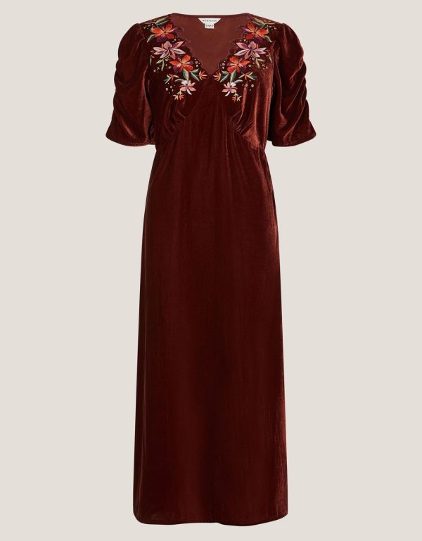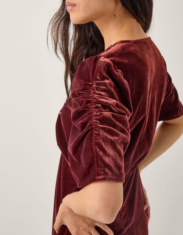 Channel your inner Bridgerton. Designed in illustrious jewel-toned velvet,this midi dress has been embroidered with eye-catching florals around the neckline. Featuring ruched half-sleeves,you’ll feel like you’re off to a ball every time you leave the house. Copper