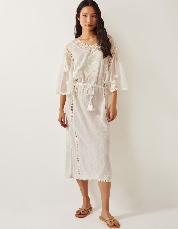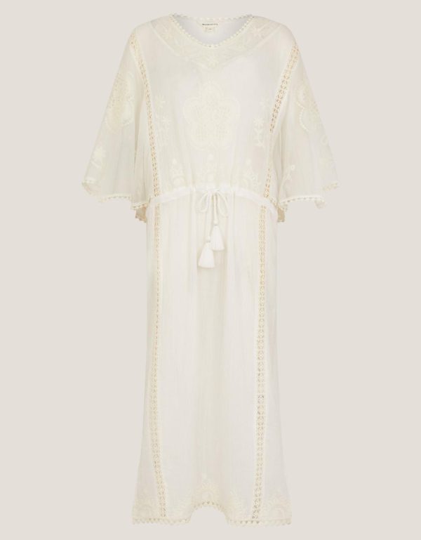 Boho beach essentials. A cute layer for slipping on over swimwear when you’re heading to the pool bar,this kaftan is designed with mesh sleeves,decorative floral embroidery and crochet-inspired panels. White