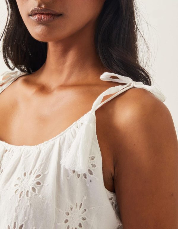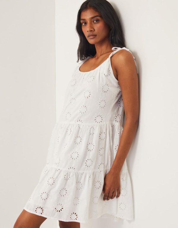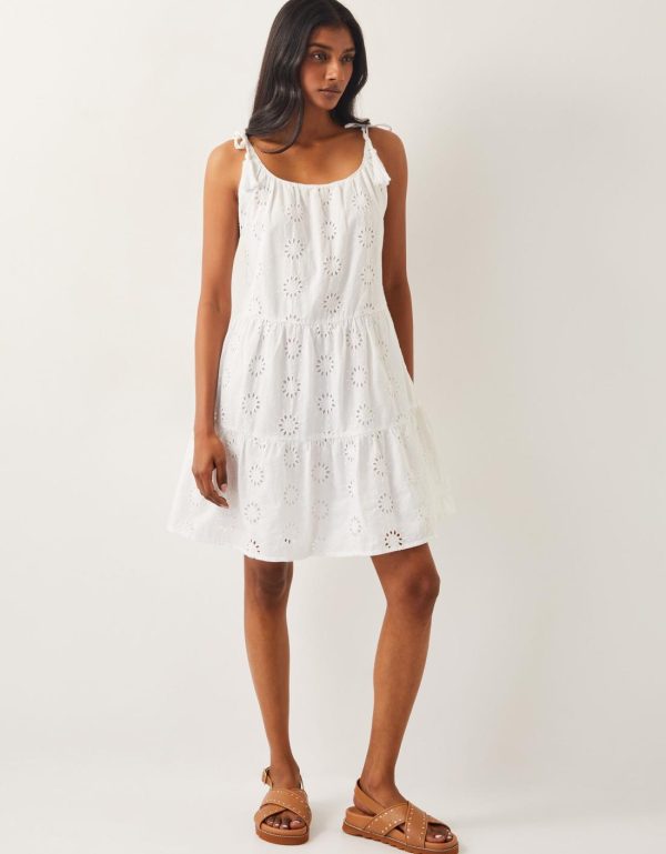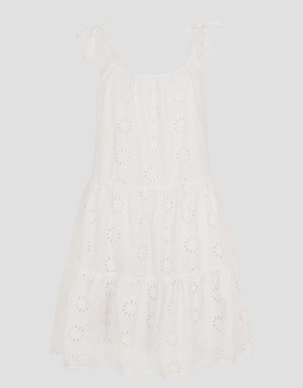 Slip on for summertime. Designed with all-over broderie floral,this mini dress hangs from the shoulders with bow detail straps,falling into a tiered mini skirt. Best paired with sparkly sandals. Pink