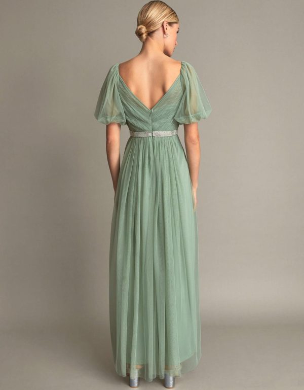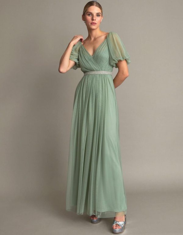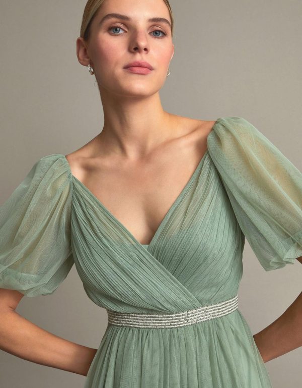 Unbeatably angelic,Meghan was made for the most special of events. She features a ruched bodice in a wrap finish,with embellishments to enhance the waist and puff sleeves for an airy fit. Prepare to mesmerise anyone who sets eyes on the floaty skirt,falling delicately in pleated mesh to maxi length. Green