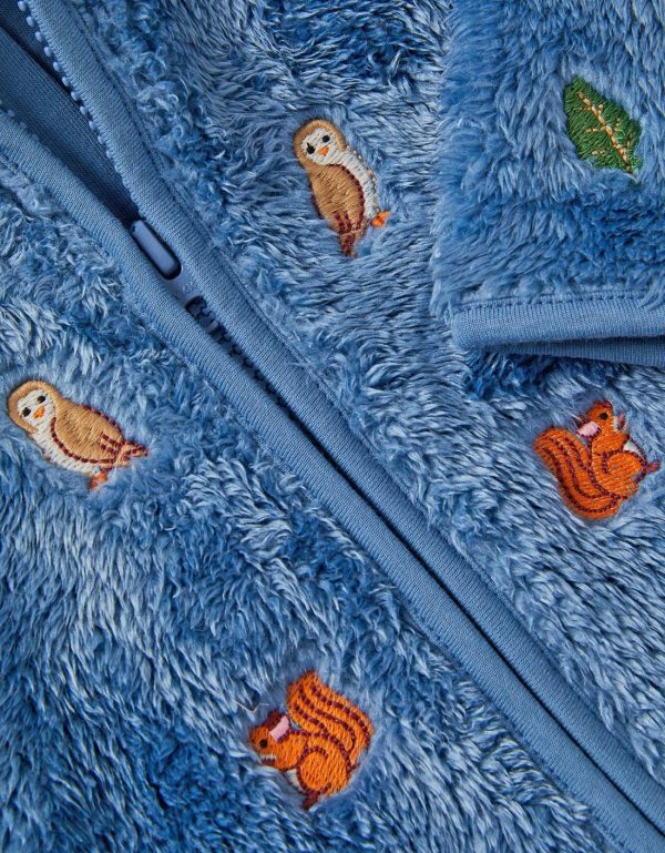 Cozy cocoon. Keeping them warm from pram to playdate in the park,this hoodie is made with super snuggly fleece fabric and friendly woodland creatures and motifs embroidered all-over. Finished with a zip fastening for easy dressing. Blue