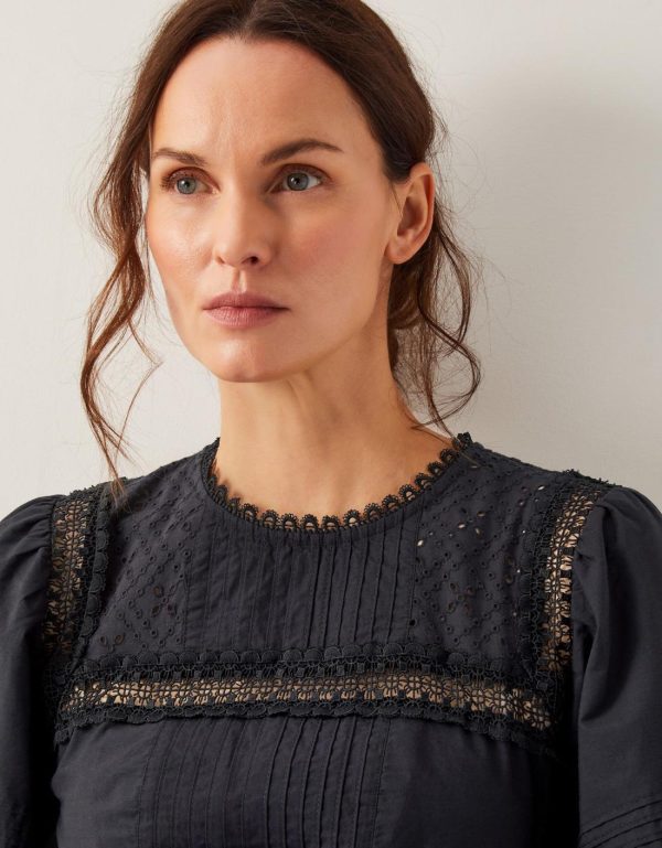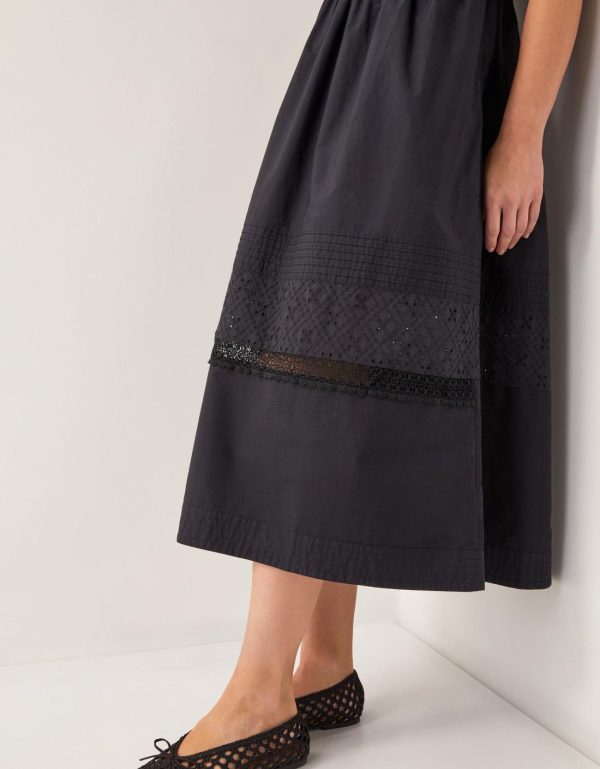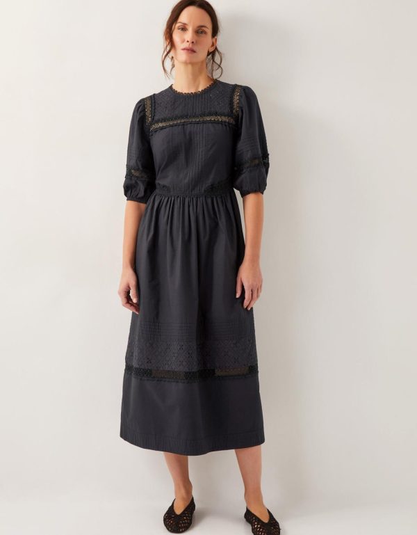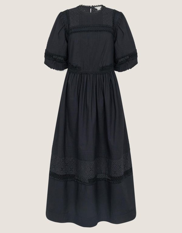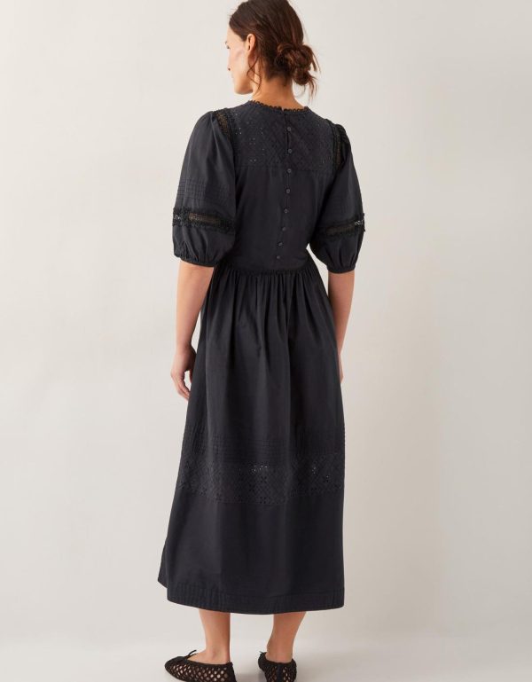 Totally timeless. Made from breathable cotton fabric,this dress is decorated with intricate broderie detailing and sheer lace-embroidered panels through the puff sleeves,bodice and midi-length hem. Dress up with statement heels or style casually with your favorite flats. Fastens with buttons at the back and a zip to the side. Black