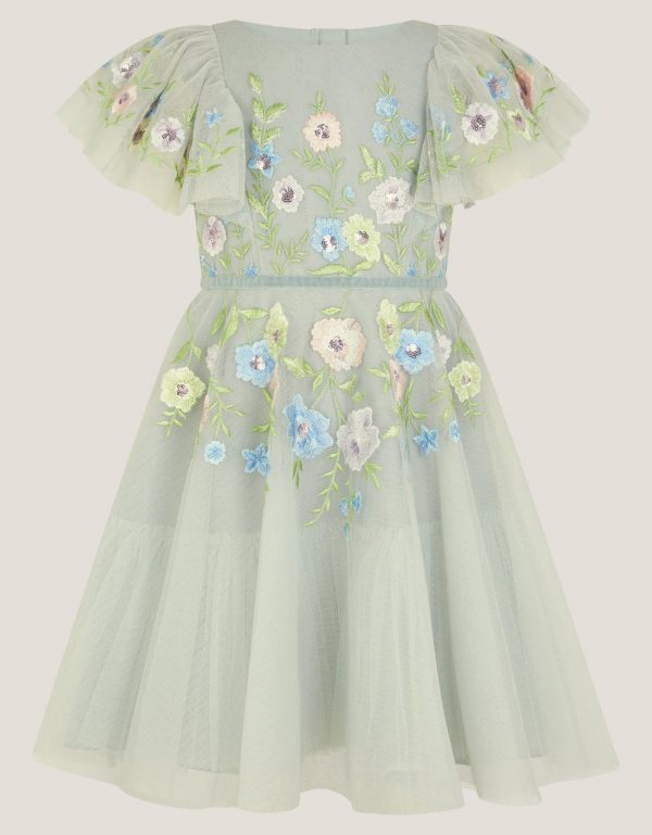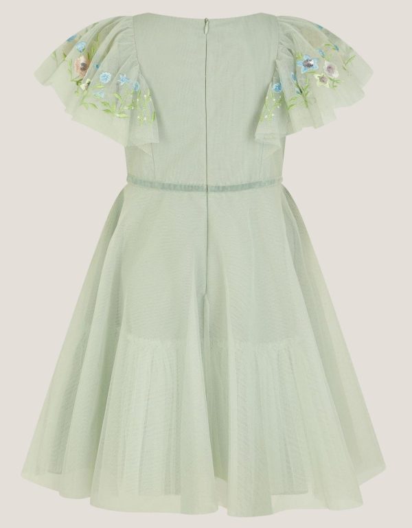 Party petals! Made for little ones to show off at parties and special occasions,this dress is cut in a skater silhouette for a twirl-worthy finish. Designed in delicate tulle,it’s decorated with floral embroidery and sparkly sequins trailing down the flutter sleeves,bodice and waist. Includes a discreet back zip fastening. Green