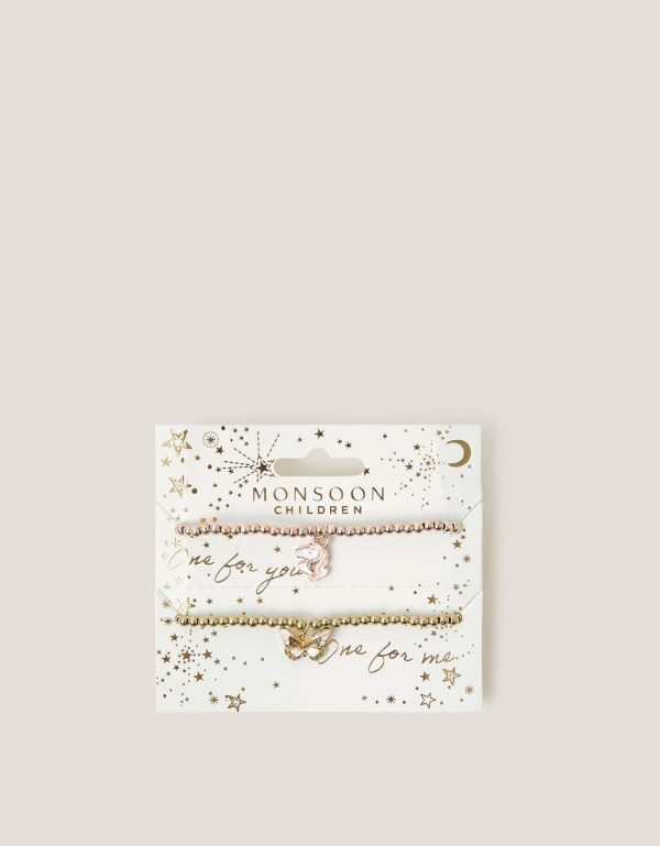 One for them,one for their bestie. Perfect for gifting,this sweet set comprises two beaded bracelets with a unicorn and butterfly charm to finish. Two included.