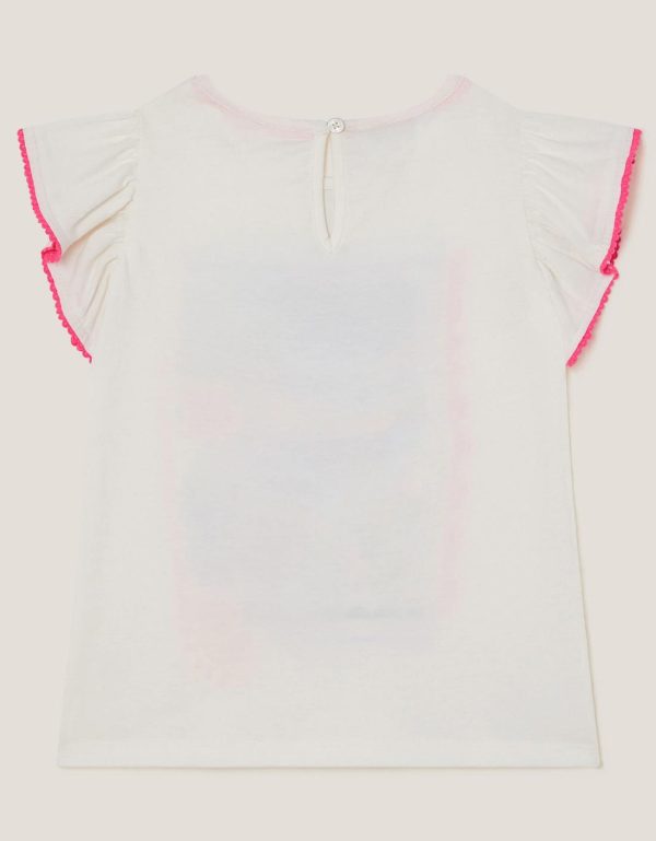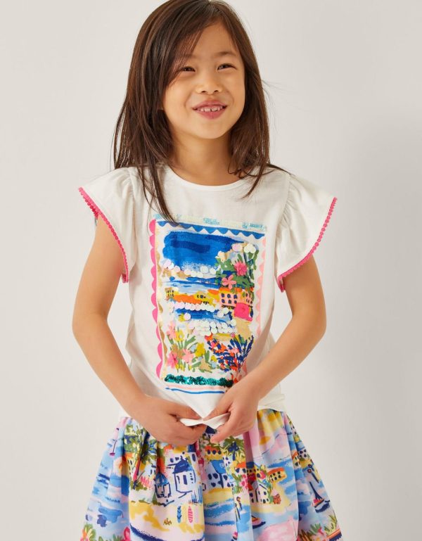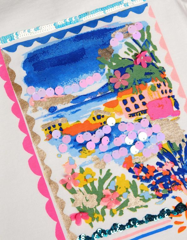 Vacay uniform. Embellished with sparkling sequins and shiny shores,this T-shirt presents a sunny resort illustration for easy dressing on summer getaways. Finished with ruffle sleeves and scallop lace to the trims. Ivory