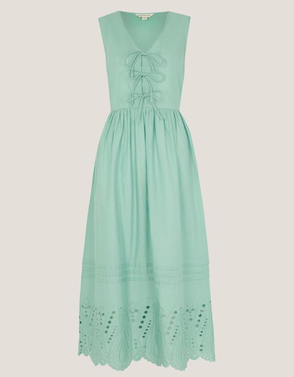 Anyone care for a mint? Feminine and flouncy,this dress is made for showing off in summertime. Soaked in a bright mint hue,it’s decorated with a trio of bows through the bodice and broderie details around the hem.
