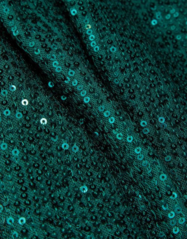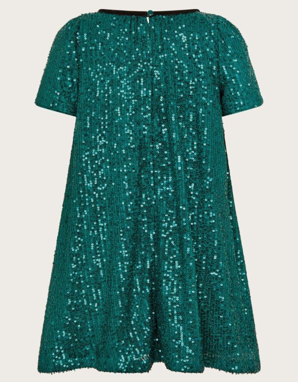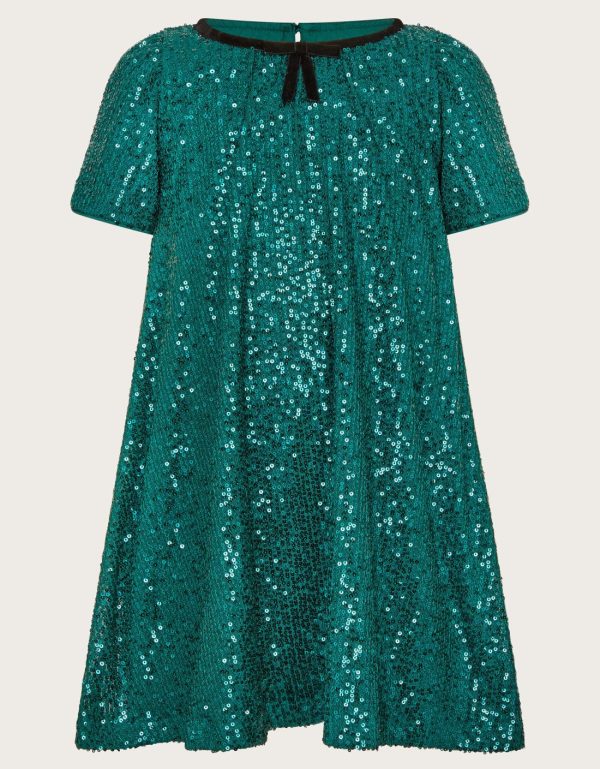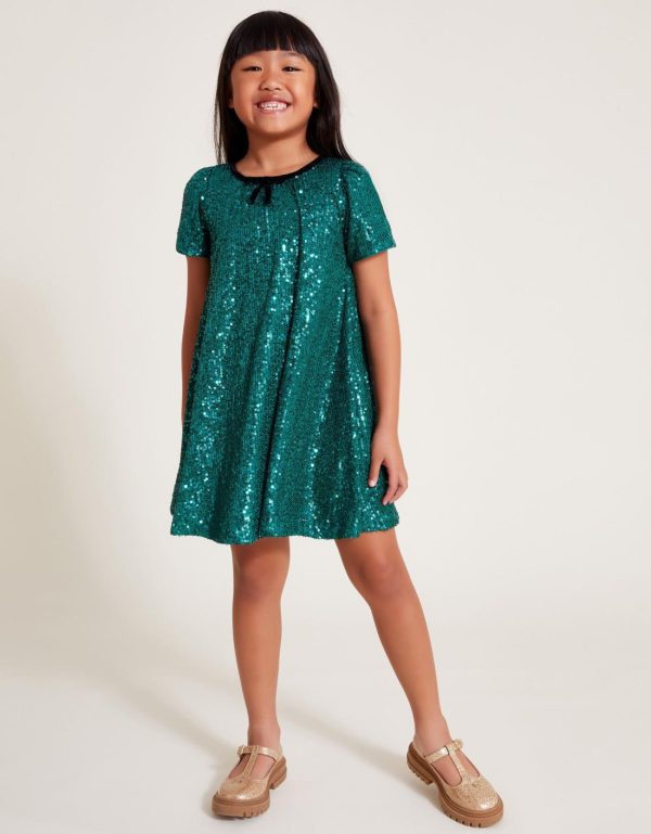 Teal-y cute! Stitched with endless sequins over the swishy A-line silhouette,this sparkly frock is ready for partying. Finished with a black velvet bow decorating the neckline and button fastenings to the back. Green