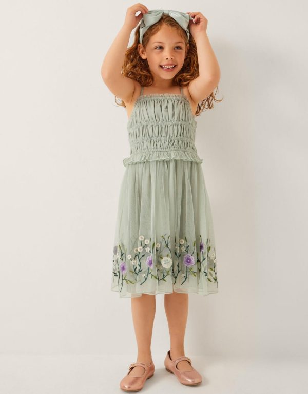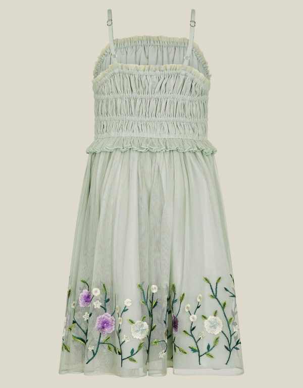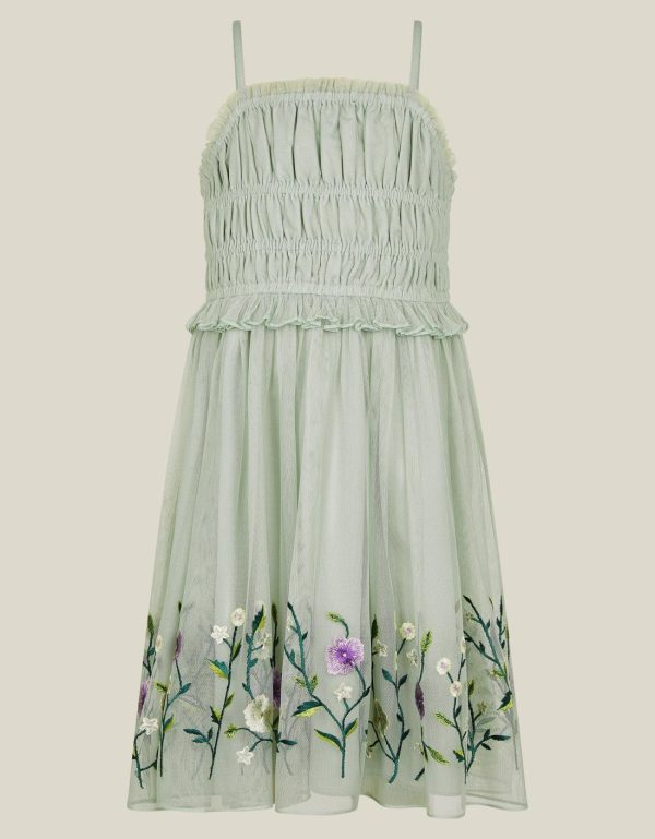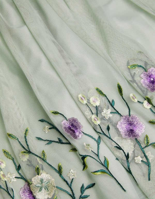 Float like a fairy! Built with layers of tulle and ruffles,it’s a wonder this dress doesn’t come with wings. Featuring beautifully embroidered florals through the skirt,it features spaghetti straps and a shirred bodice for comfort. Green