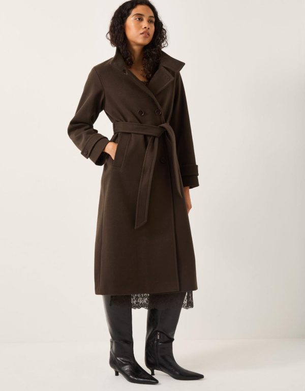 Forever elegant. A winter essential,this classic coat features a modern funnel neck design,tie waist,and front pockets in a dreamy chocolate brown tone. Finished with button fastenings. Brown